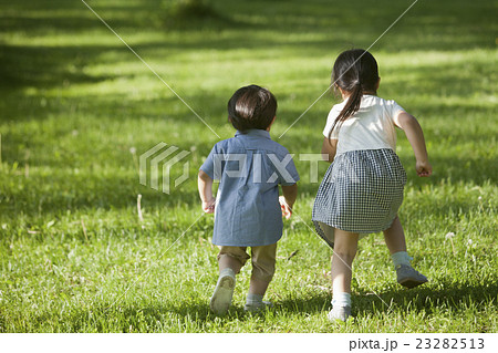 與家人一起出去的插圖素材:精力充沛的孩子和年輕的夫婦看著它