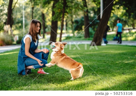Portrait of woman with dog Welsh Corgi Pembroke in dog park