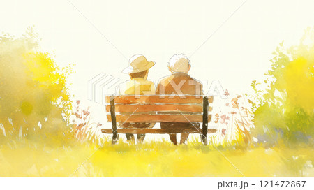 一對老年夫婦手牽手在公園散步的溫柔插圖(老年生活/健康材料)