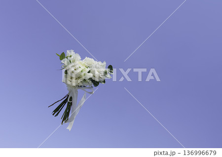 一位身穿純白色婚紗的新娘向一群女士拋出一束花