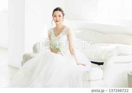 一位身穿純白色洋裝的女子躺著,胸前放著一束花束的圖片