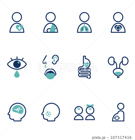一組與月經、經前症候群、藥物處方、避孕和線上醫療相關的圖標插圖。
