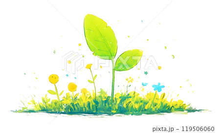 A young plant stands out amidst tiny green shoots, bathed in the hopeful light of a new dawn, symbolizing growth and new beginnings.