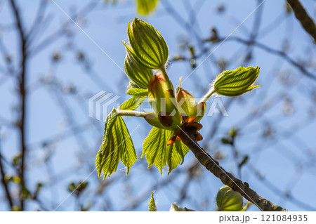 Green Chestnut Leaves in beautiful light. Spring season, spring colors. Aesculus hippocastanum, the horse chestnut