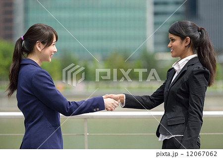 Two successful young mixed race business women shaking hands in front of office buildings