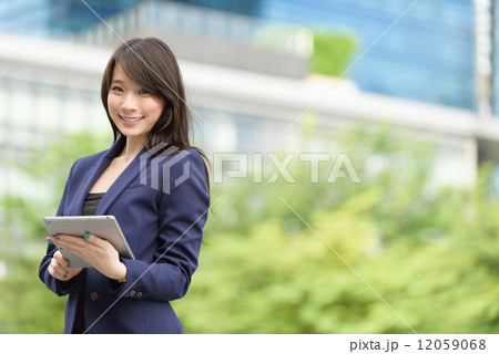 Successful young Chinese business woman with mobile device tablet iPad in front of office building