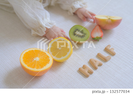 嬰兒的手和半顆生日水果