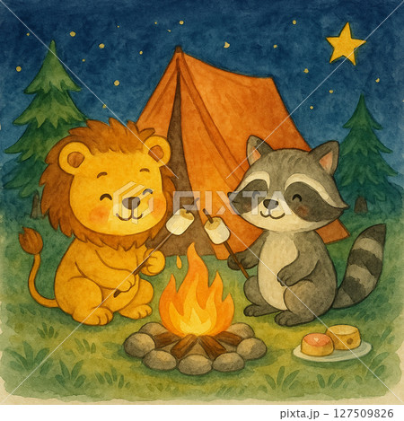 獅子與浣熊夜間露營插畫|篝火棉花糖的美好時光|獅子與浣熊夜間露營 / 篝火棉花糖