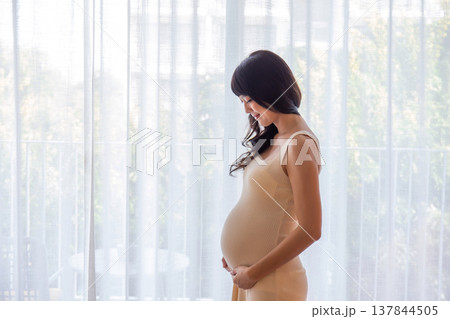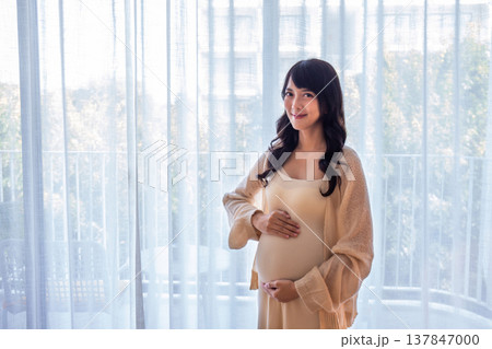 Pregnant caucasian female standing near window in sunlight holding belly