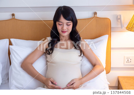 Pregnant woman sits with her hands gently stroking her belly, showing love, warmth and concern for the baby on the bed with a happy smile.
