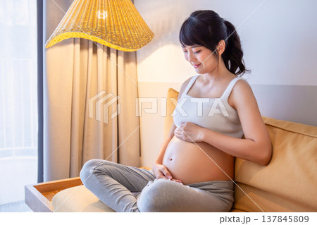 Young expectant mother sits on a comfortable sofa, cradling her pregnant belly with a gentle smile, anticipating new life