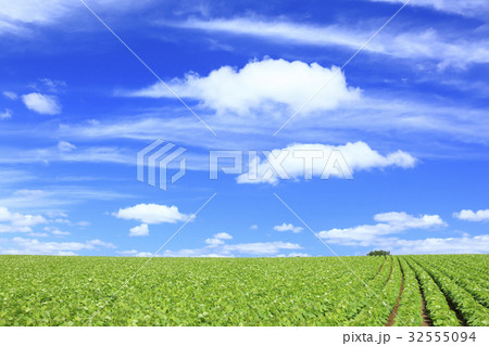 拍攝仲夏的景觀,北海道綾部町的azuki豆田裡盛開著黃豆的黃色花朵