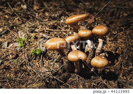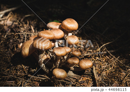 Close-up Edible mushrooms of honey agarics in a coniferous forest. Group of mushrooms in the natural