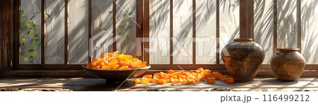 Hoshigaki Dried Persimmon Banner on Traditional Drying Room Backdrop with Shadows