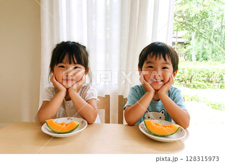 可愛的孩子們在瓜前微笑並托著下巴