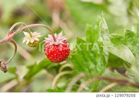 Close up of wild strawberries growing in green foliage with unripe and ripe