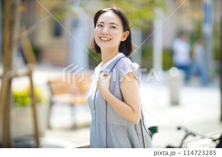 一位年輕女子一邊觀光一邊欣賞櫻花