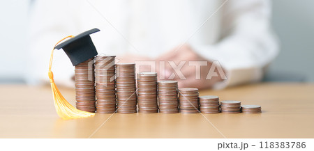Money saving for Education, Scholarship, Student loan and debt and study future plan concept. Coins stack growing up with graduation hat on table