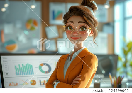 A confident professional woman in a vibrant office setting, showcasing modern business analytics on a screen.