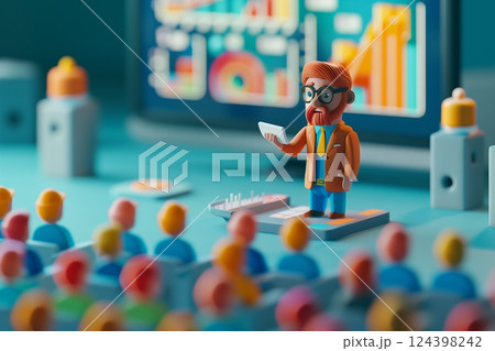 A miniature figurine presenting data in a colorful business seminar, highlighting growth and audience engagement.