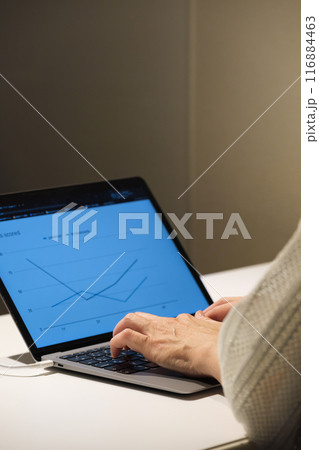 Senior confident woman sitting on workplace at the desk working on laptop at home.