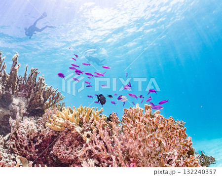 一群小花鯽、藍雀鯛和其他魚類。美麗的珊瑚礁和熱帶魚群。沖繩縣島尻郡慶良間諸島座間味島和阿室島