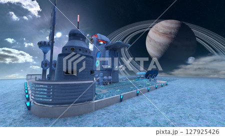 沐浴在陽光下的太空船、行星和飛機的輪廓