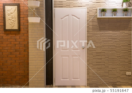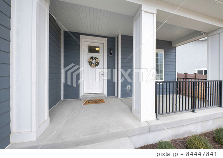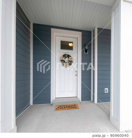 Wooden front door of a home. Front view of a wooden front door on a brick house with windows plants and a wide view of the porch and front walkway. Horizontal shot.