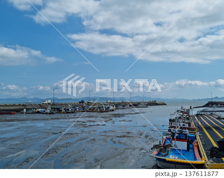 It is a tidal flat near the sea with anchored fishing boats.