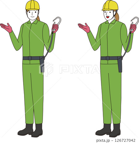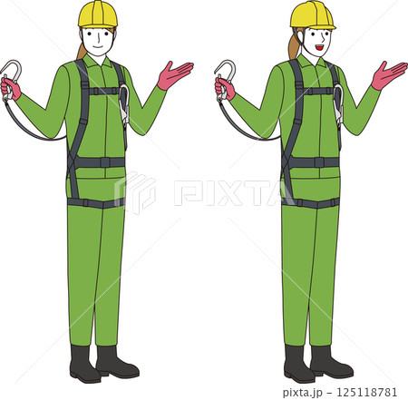 身著全套安全帶和掛繩的建築工人。微笑的女人