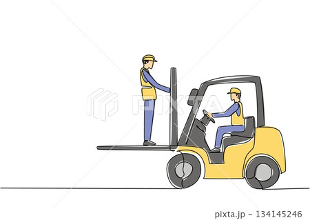 Single line drawing of two male workers with a forklift where one stands on the forks, representing dangerous workplace actions for National Forklift Safety Day in an industry concept.
