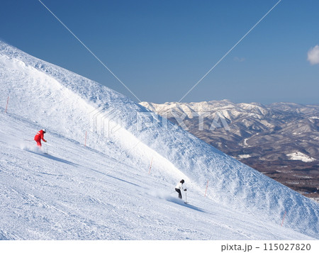 早晨,滑雪者在新壓實的雪上(北海道新雪谷)