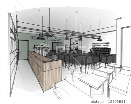 Architectural sketch of a modern cafe interior with wooden furniture, a counter with coffee machines, hanging lights, and a hallway leading to another room.