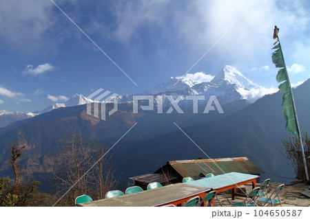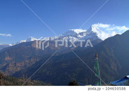 Annapurna peak and Prayer flag on poon hill in Himalayas, nepal
