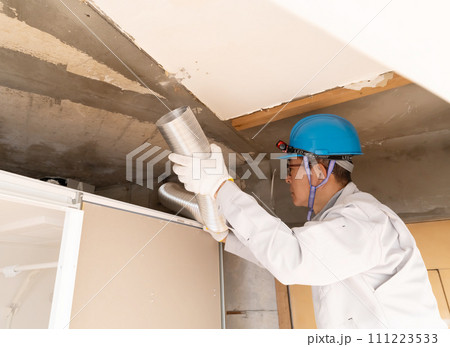 空調管道和室外機從裝飾蓋中伸出 空調安裝作業