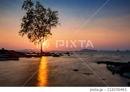 Silhouette couple and tree by stone arch beach at sunset, Krabi