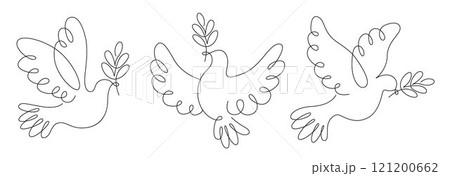 Dove, pigeon symbol of love peace and freedom in simple line vector, flying dove with olive branch