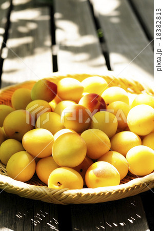 閃閃發光的水滴梅子和竹籃 夏季水果圖片(早期)