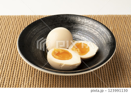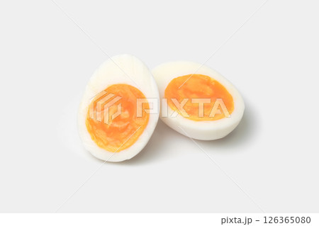 半熟的水煮蛋(調味蛋)切成兩半。手繪水彩畫,描繪蛋料理。