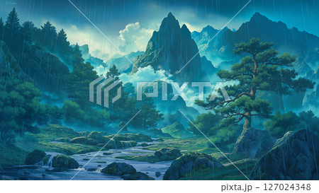 雨天山河景觀,動漫風格