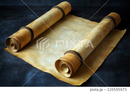 Antique Scroll on Wooden Table, Vintage Paper with Ornate Design, Rustic Background