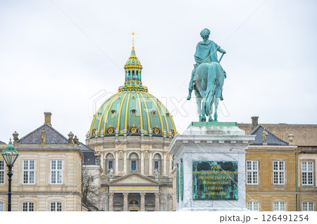 Frederik's Church, known for its stunning Rococo architecture, towers over Amalienborg Square, with the majestic statue of King Frederick V prominently displayed, showcasing Denmark's history.