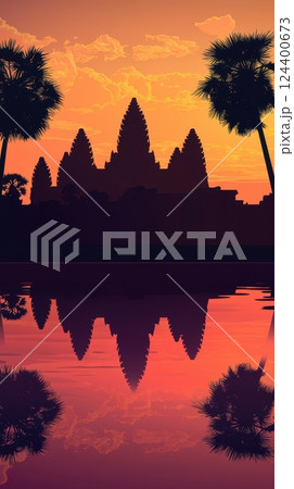 Cambodian silhouette background featuring Angkor Wat and palm trees with a warm gradient sky
