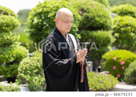 手拿珠子在墳墓前念經的佛教徒的形象