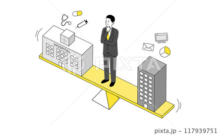 平衡治療和工作的形象的插圖,一位站在天平上的男性商人,向量圖