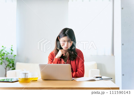 一名年輕女子在假期期間在客廳的桌子上使用筆記型電腦進行線上課程和課程。