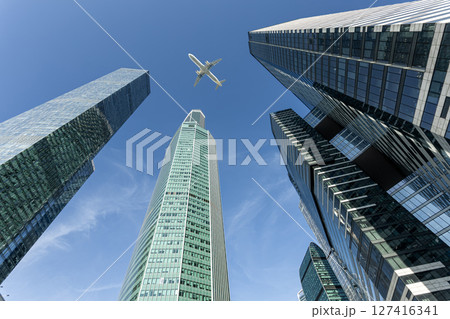 Modern glass skyscrapers on a clear day and passenger airliner fly over