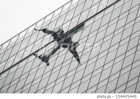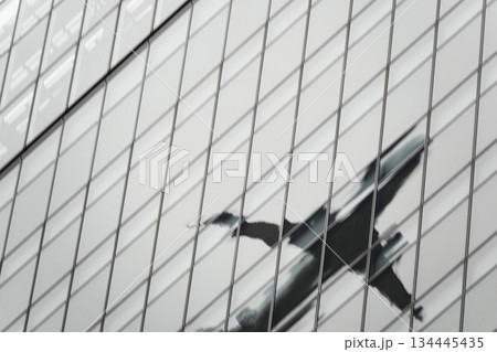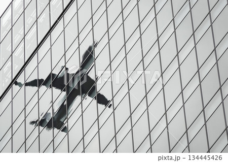 客機的倒影映在建築物的玻璃上。