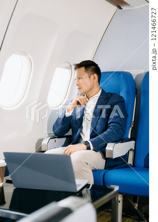 Photo of a frustrated man sitting on an airplane with her head in her hands. Asian Businessman sitting in airplane working