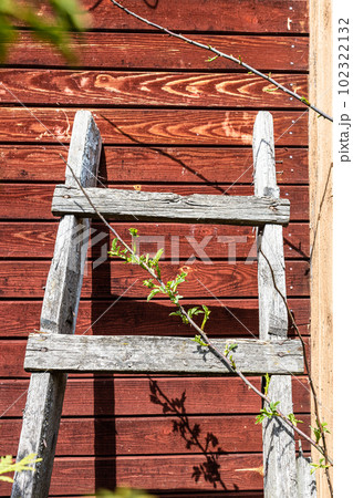 old wooden ladder is leaning against wall
